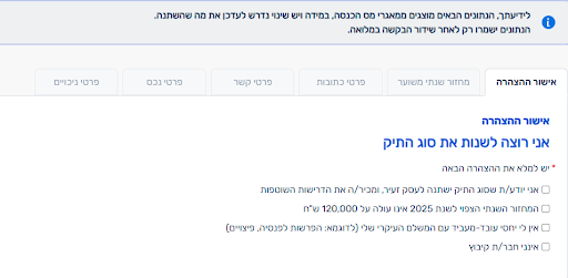 2.מילוי פרטים והצהרות: לאחר ההזדהות, תתבקשו למלא פרטים אישיים, פרטי עסק, ולאשר הצהרות שונות הקשורות למעמדכם כעצמאים.
