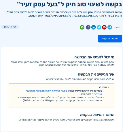 חשוב לדעת: תנאי מקדים להשלמת הבקשה המקוונת הוא ביצוע תיאום מס עבור הכנסות העסק.